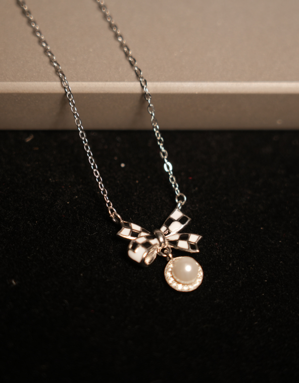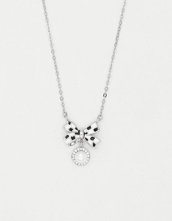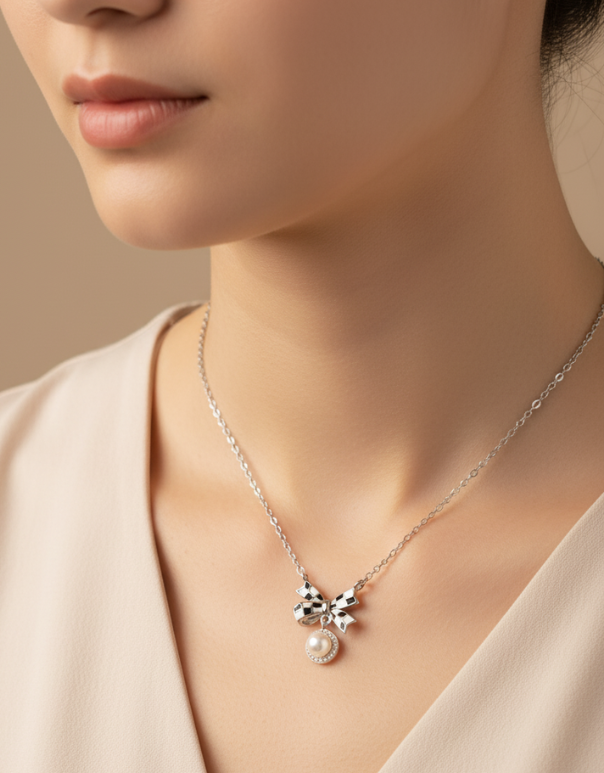 Crafted in 925 sterling silver and finished with a delicate white pearl, this bow-shaped pendant symbolizes femininity and grace. Its minimalist design, accented with a central pearl, makes it a radiant and stylish piece for any collection.