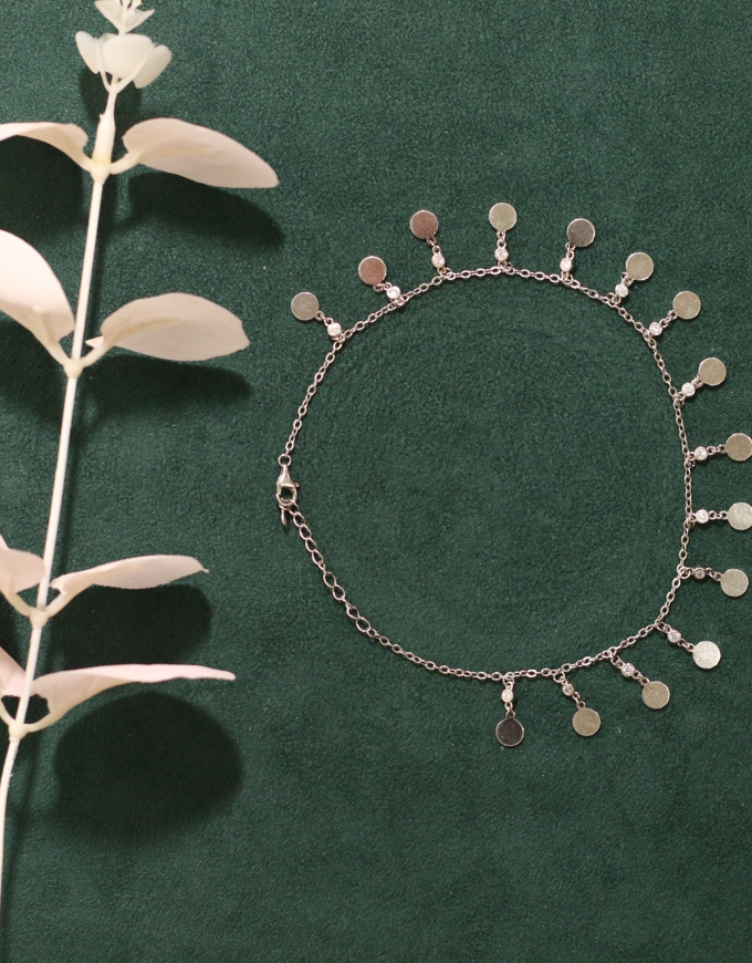 Featuring delicate circular patterns, the Circle Gleams Anklet symbolizes unity and grace. Its sleek design makes it a versatile piece for everyday elegance.