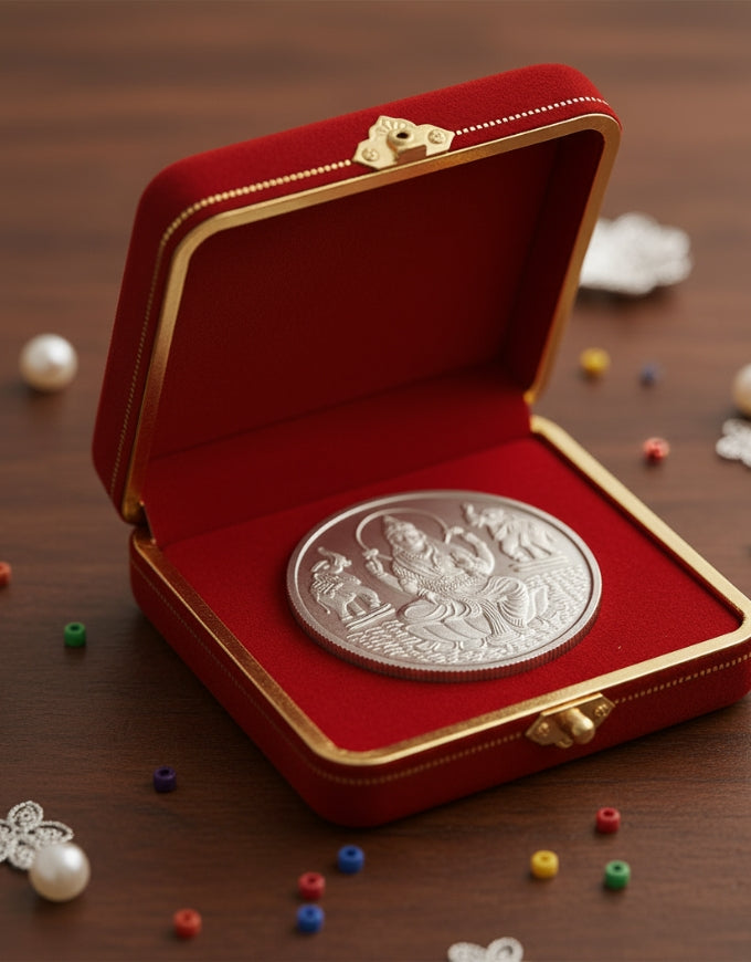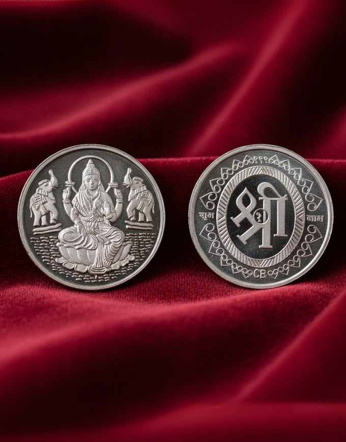 A pure silver coin engraved with Goddess Lakshmi on one side and the sacred 'Shree' symbol on the other, attracting wealth and prosperity in worship. These coins are designed not only for spiritual use but also as auspicious gifts during festivals and special occasions. Multiple weight options allow you to select as per your devotion or gifting needs.