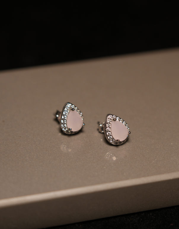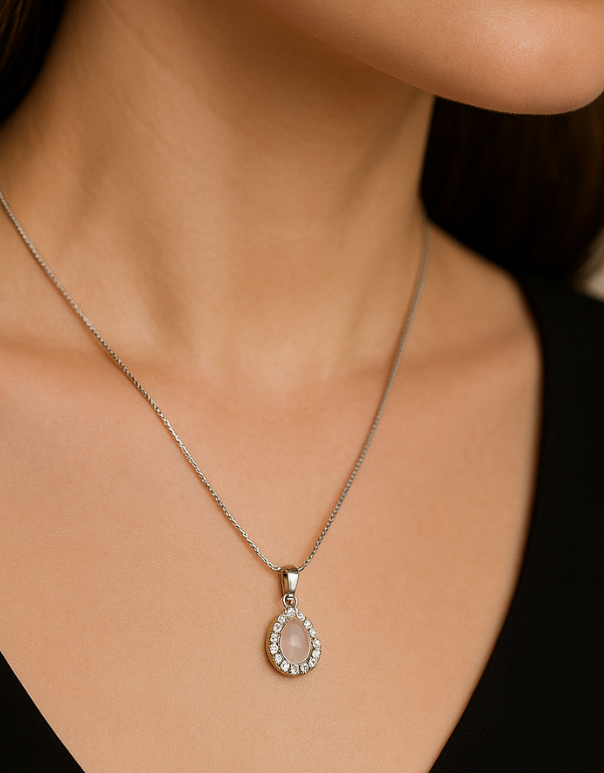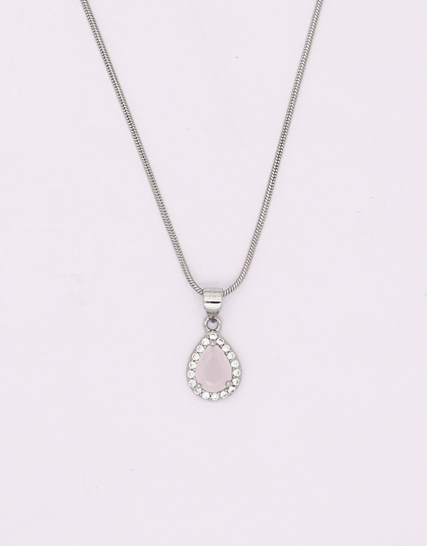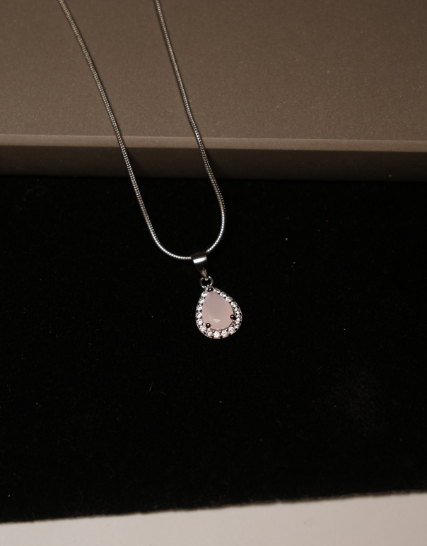 This silver pendant features a teardrop-shaped coral pink stone at its center, creating a subtle yet eye catching elegance for everyday wear or special occasions.
