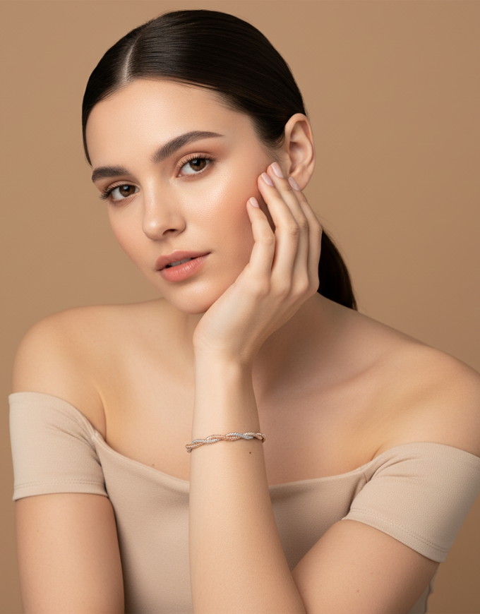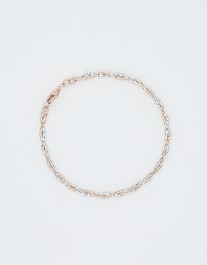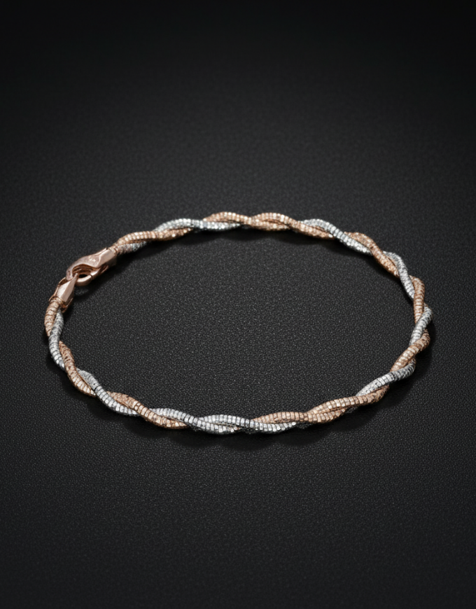 Explore the intricate beauty of our Harmony Weave dual-tone bracelet. The contrast plating adds elegance and versatility to a piece that feels both modern and timeless.