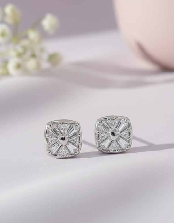 Inspired by the timeless love between a couple, these silver earrings feature a square design with a floral pattern inscribed inside, accented with sparkling zircons. Elegant and meaningful, perfect for gifting or self-adornment.