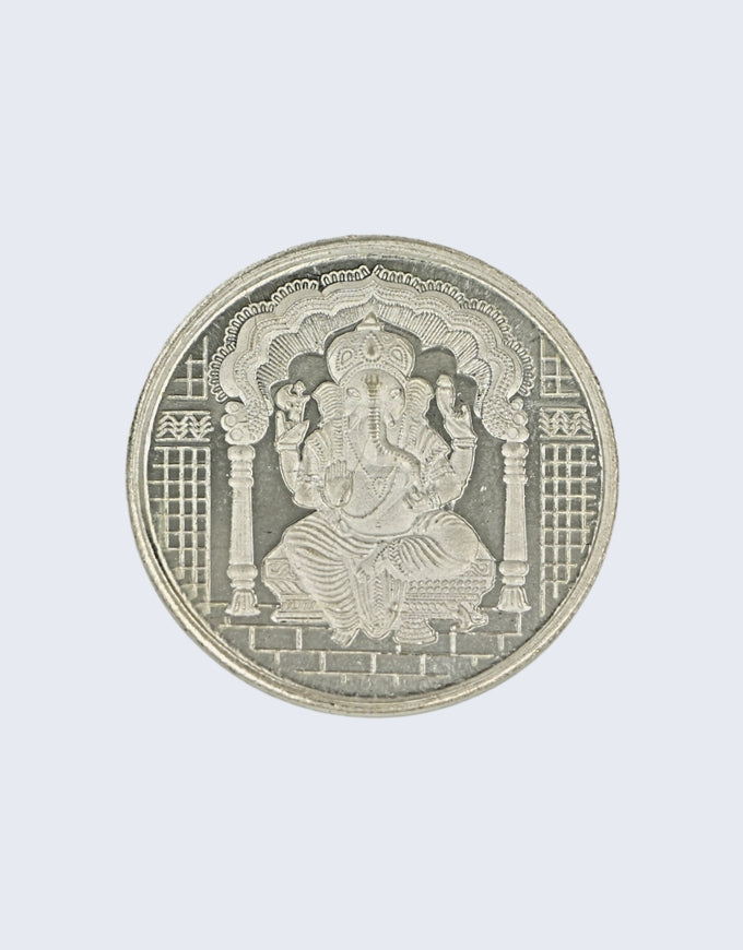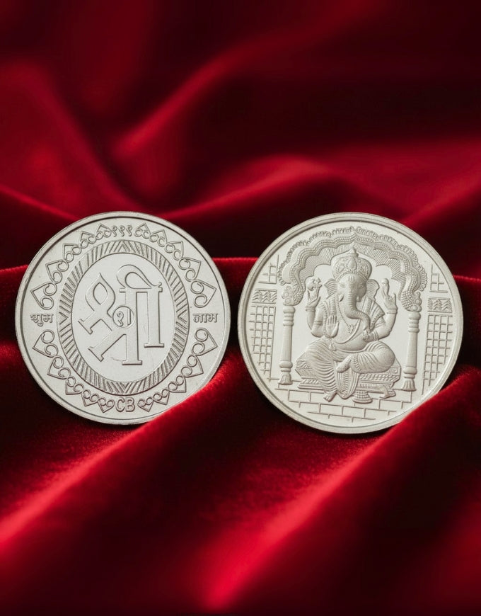 A divine silver coin featuring Lord Ganesha on one side and the sacred 'Shree' symbol on the other, bringing wisdom, success, and prosperity in pooja rituals. These coins are available in multiple weight options, making them suitable for different needs—whether for personal pooja use, gifting, or large-scale religious events.