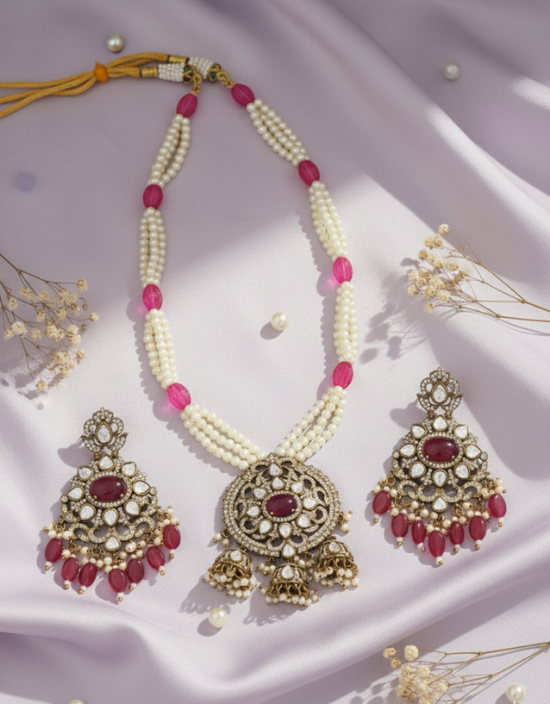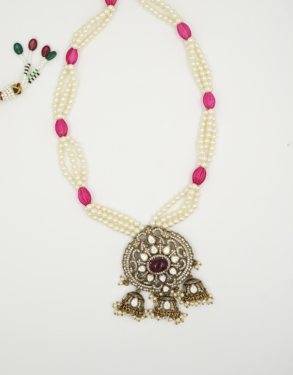 Celebrate life’s most cherished moments with this wave designed silver necklace studded with pearls and cut pink pearls. Elegant and timeless, perfect for any occasion.
