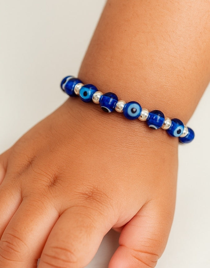 Charming and protective, this evil eye silver bracelet adds style and safety to little ones’ accessories.