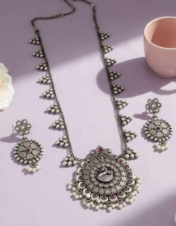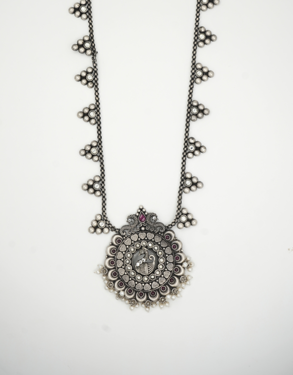 This oxidised silver necklace features a medley of geometric and floral patterns with enamel detailing. Perfect for inspiring elegance in casual or black dress ensembles.