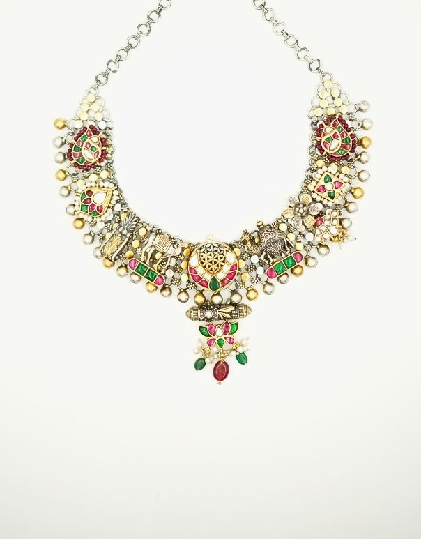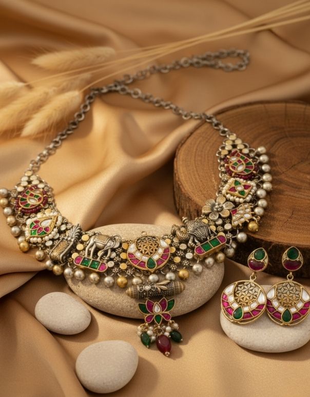 Celebrate timeless craftsmanship with this Traditional Camel Necklace, featuring a grand oxidized silver base adorned with colorful stones and intricate detailing. The necklace beautifully captures royal heritage and artistic precision, making it an exquisite piece for festive and traditional occasions. The vibrant red and green accents bring life to its regal charm, while the antique finish adds depth and vintage allure.