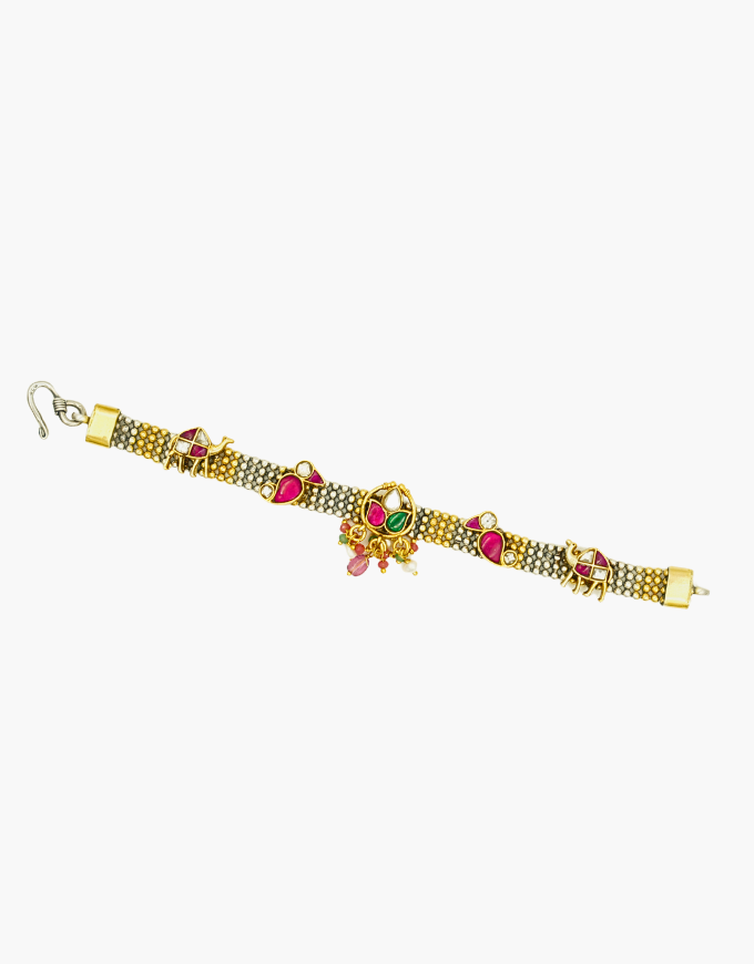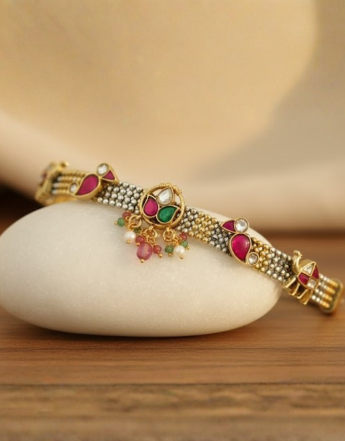 Embrace timeless artistry with this Traditional Camel Bracelet, beautifully handcrafted in 925 silver. Adorned with vibrant green and pink stones, it features intricate camel and leaf motifs that reflect royal Rajasthani elegance. Perfect for festive wear and ethnic occasions, this bracelet brings together culture and sophistication in one stunning piece.